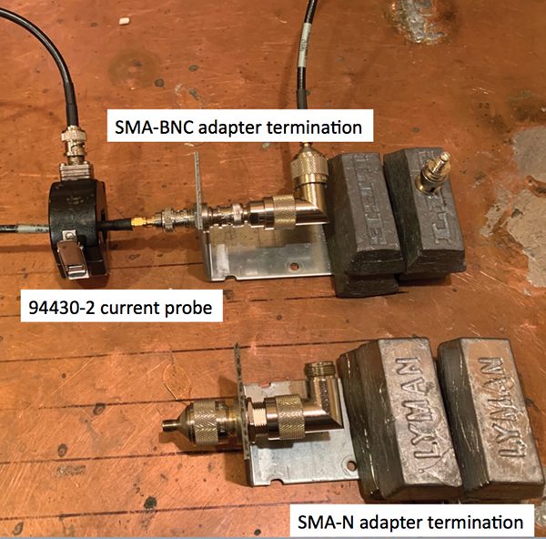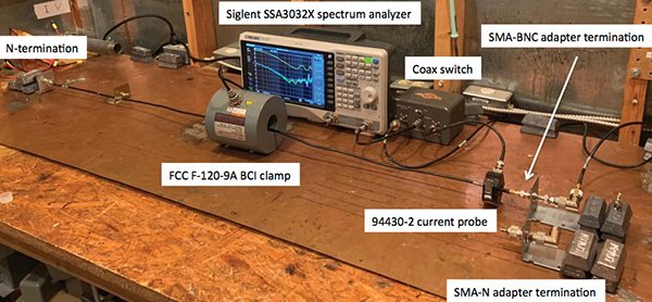 Figures 2a, 2b, 2c, and 2d show the measurement. LMR-195 50 Ω coaxial cable with an N connector at one end and SMA at the other has its termination bonded to a ground plane at each end. A bulk cable injection (BCI) clamp induces an RF potential on the cable shield, and a current probe monitors the resultant current at the connector of interest. Both current and the induced potential between coaxial center conductor and ground are displayed on a spectrum analyzer (Figures 3 and 5). Voltage and current may be compared to assess transfer impedance. For this investigation, transfer impedance nominal value is not of great interest; it is the change when swapping out a threaded (N) for a bayonet (BNC) connector, or the effect of wiggling a connector, that is of primary interest.