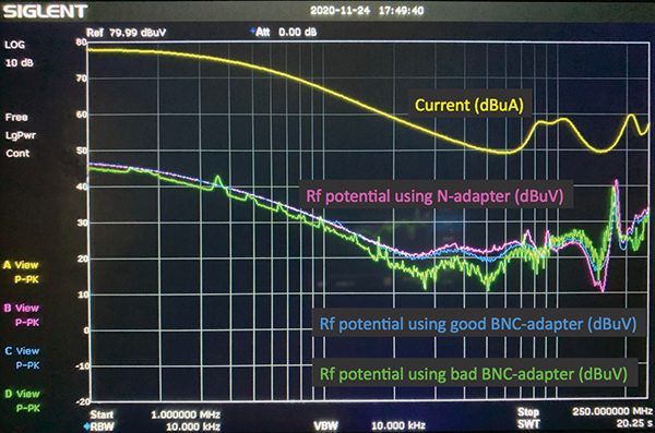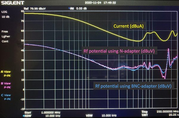 In Figures 3a and 5, the yellow curve represents current. The 94430-2 current probe has a 0 dBΩ transfer impedance from 1 – 250 MHz, so the reading in dBuV is also the current in dBuA. In Figure 3a, the pink curve is the RF potential measured using an SMA-to-N adapter, and the blue curve is the RF potential using an SMA-to-BNC adapter. There is very little difference between BNC and N traces over this frequency range.