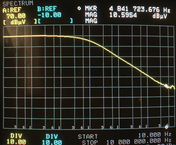 So instead, as shown in Figures 7a and 7b, a current probe was placed around the entire cable, measuring the common mode current, of which there should theoretically be none at the frequencies where we worry about a connector leaking, that is, at and above 10 MHz.
