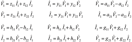 The coefficients in each set of equations in Eq. (1) are called the parameters of the two-port network. We refer to them as the z parameters, y parameters, a parameters, b parameters, h parameters, or the g parameters of the network. All parameter sets contain the same information about a network, and it is always possible to calculate any set in terms of any other set.