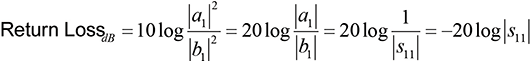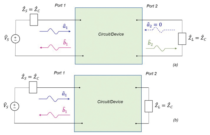 When evaluating the two-port network parameter sets in part I, we selectively measured a voltage or current at a given port, when one or both ports where either open- or short-circuited (see Table 1). When evaluating the s parameters we cannot use open- or short-circuited measurements as they are not reliable at high frequencies. So how do we translate Eq. (15) into a practical application?