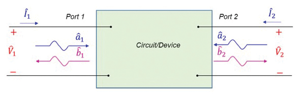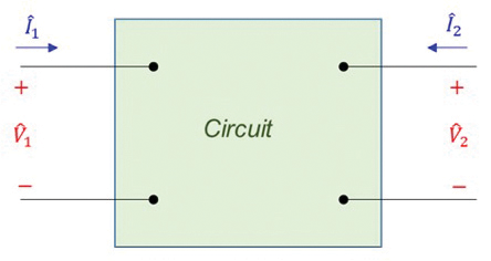 In EMC the two-port network analysis is usually carried in a sinusoidal steady-state where the voltages and currents are sinusoids and as such, at each frequency, are described by their amplitudes and phases. It turns out that such an analysis can be easily performed using complex numbers, called phasors, (instead of real time functions) which represent these amplitudes and phases. To differentiate a complex variable from a real variable let’s place a “hat” above it. Thus, V and I denote real variables, while ![]()