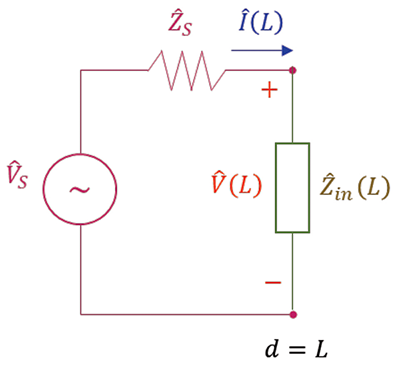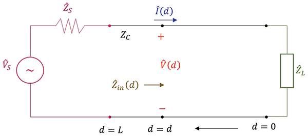 In this model, the load is located at d = 0, and the source is located at d = L. The voltage, current, and input impedance now are a function of d, when moving from the load towards the source. Note that the input impedance to the line at any location d,