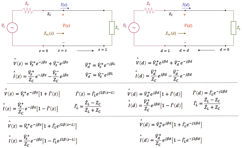In summary, the voltage and current at any location d, away from the load, can be obtained from