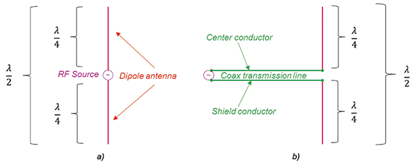Symmetrically-driven half-wave dipole consists of a thin wire fed or excited at the midpoint by a voltage source. The total length of a dipole equals half-wave length. Each leg of a dipole has a length equal to the quarter of a wavelength, as shown in Figure 1 (a). Often the voltage source is connected to the antenna via transmission line, as shown in Figure 1 (b).