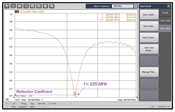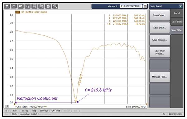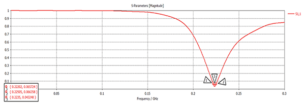 While the input impedance of the antenna requirement was satisfied (low reflection coefficient at resonance), the resonant frequency of the antenna was found to be at 210.6 MHz (instead of the target 222.5 MHz), as revealed by the plot in Figure 13.
