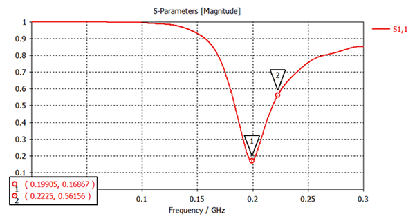 It is not necessary to use the exact speed of the signal propagation, as the antenna length will be determined using an optimizer program, as discussed later. The simulation was performed from DC to 300 MHz. The resulting reflection coefficient magnitude (s11 parameter magnitude) is shown in Figures 6 and 7. Figure 6 reveals that the antenna resonates at 199 MHz which is not within the antenna’s desired operating frequency of 220 MHz to 225 MHz.