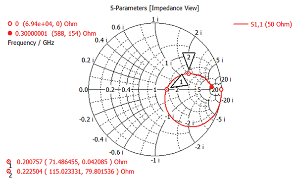 Figure 7 confirms this result by showing that impedance is real at 200.8 MHz, and equal to 71.5 Ω.