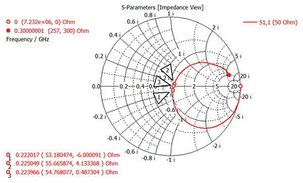 The impedance is real valued (around 54 Ω) at 223.5 MHz as shown by the Smith chart in Figure 9. It was also observed that this simulation with asymmetrical elements has a wider bandwidth than the simulation with symmetrical elements.