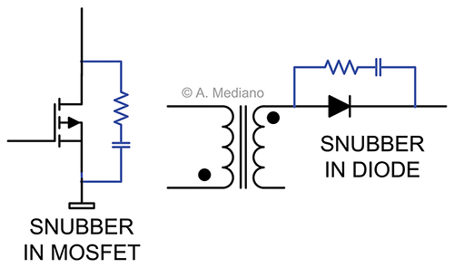 It is common practice in power electronics to use simple resistor-capacitor (RC) networks to reduce the stress in power transistors and diodes due to voltage spikes created by parasitic inductances and capacitances in transformers, inductors, diodes, transistors, layout, and other components.