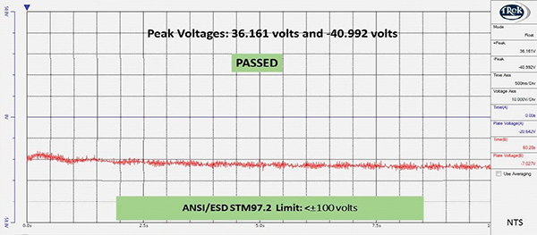 As you can see, while both systems passed the requirement of ANSI/ESD S20.20, the conductive floor generated significantly lower body voltage, which could be important in a very sensitive environment and would certainly reduce the risk of a potential failure due to an ESD event.