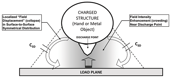 On application of the initial excitation ESD impulse, through its intrinsic source impedance Zs and an impulsive field displacement Ei, is instantaneously produced in the region of the charged structure that is causing the discharge. The specific size of this field displacement has a causal relationship to the size and shape of the structure causing the discharge, as well as the “load plane” (product surface) that is being subjected to the discharge as it opposes the structure being discharged.