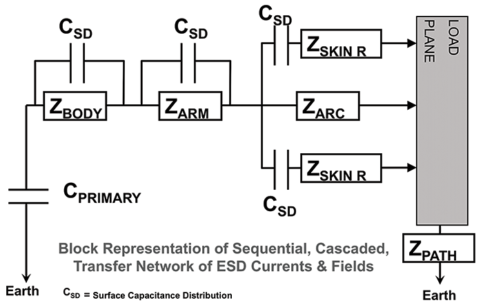 The initial ESD “circuit equivalent” is a spatial electric field displacement (collapse) between the charged structure (e.g. a hand) and a load plane, with the field intensity collecting at the discharge point. This displacement is between two structures, and is not dependent upon earth ground. This can be represented by distributed capacitance as a “surface distribution” that exhibits a “very low” transfer impedance function.