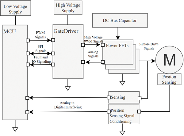 - Low voltage drive signals—These signals are used for the command and control of drivers, typically driven by a timer circuit. They generally interface with a level shifter or gate driver that controls the motor.