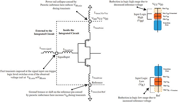 The model shown in Figure 3 depicts an input logic circuit referenced to a VIO, primarily at DC. At the top of the input, we generally find VIO or a reference voltage, either externally fed or internally generated. The key voltage levels are when the inverter circuit recognizes a logic high, with added hysteresis, and when it recognizes a logic low, again with hysteresis. When transient characteristics are introduced, trace parasitic can significantly impact circuit performance during coupled switching transients on the reference, power, or input lines.