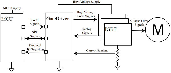 The control strategy behind an inverter and how it creates AC power from DC is complex enough to fill a book. However, at its most basic level, the motor is controlled by filtering tightly controlled pulses through motor windings to create AC currents. Since the MCU isn’t capable of driving the output switches directly, a level shifter or a more commonly found gate drive ASIC is used (often labeled a “Smart” Gate Driver). A simplified diagram is depicted in Figure 5.