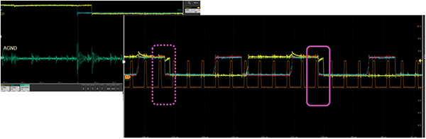 In both pictures, the magnitude of the noise on the “AGND” net causes the reference to move, caused by the orange PWM signals on the picture to the right. When lined up properly, as outlined in the solid pink box, this can cause incorrect actuation of the neighboring low voltage signal in either incorrect triggering or a missed trigger.