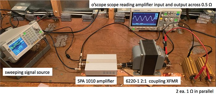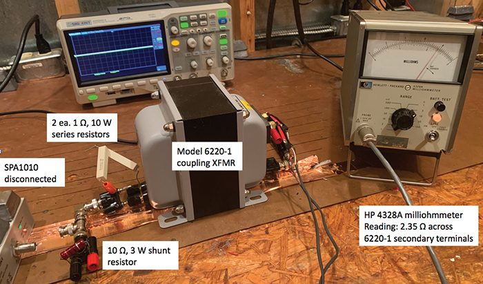 Figure 4 shows verification that a load powered through the Solar 6220-1 coupling transformer with amplifier disconnected from the primary sees under 3 Ω series impedance. The HP 4328A milliohmmeter is ideal for this measurement as its output potential is 1 kHz ac, instead of the more typical dc potential of ohmmeters and millohmmeters. A dc milliohmmeter can only read the resistance of the transformer’s secondary winding. The measured value of just under 2.5 Ω is due to the shunting effect of the secondary winding inductance in parallel with the reflected 3 Ω off the primary side.