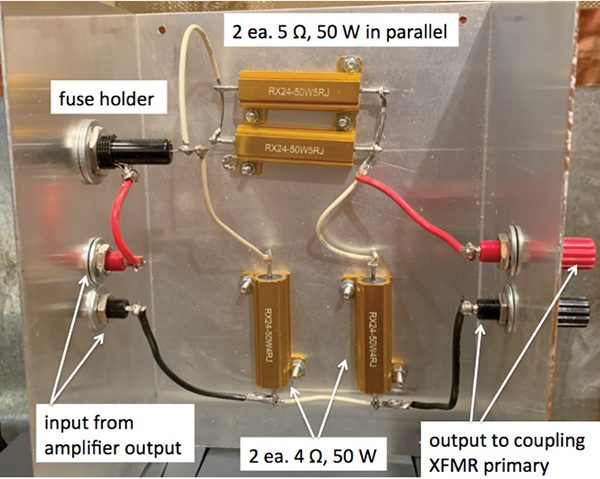 Comparing Figure 2 to Figure 1, we see lead weights on the amplifier, and 2 Ω (2 each, 1 Ω, 10 W power resistors – series resistors more visible in Figure 3) placed in series between the amplifier output and the primary side input of the Solar Electronics 6220-1 coupling transformer. The lead weights, in addition to pressing the amplifier down against the copper ground plane and heat sinking it that way, also added thermal mass in their own right and were mildly warm to the touch after several hours of full (CS101) power operation (see Note 12). The 2 Ω in series between amplifier and coupling transformer ensures that the amplifier sees a minimum 2 Ω load even when a dead short is placed across the transformer secondary output. The amplifier can operate into 2 Ω all day at the tailored 1 Vrms limit level.