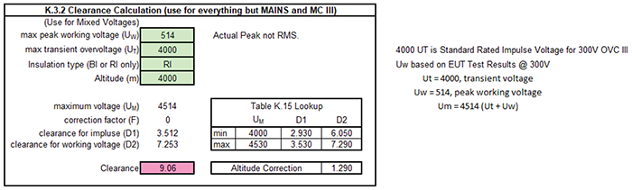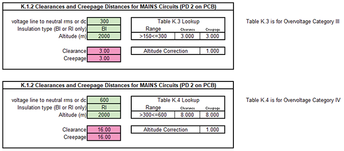 Below are example outputs of a spacings calculator created based on UL/IEC 61010-1 and IEC/UL 61010-2-030.