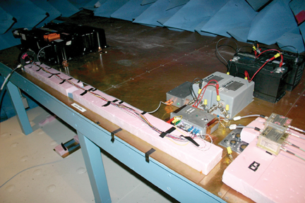 For the lower frequency range of 10 kHz – 30 MHz, a transverse electromagnetic mode (TEM) cell (Figure 1) or transmission line system (TLS) is typically used. In both cases, the field is created from an overhead structure and kept uniform/homogenous around the vehicle while various functions are monitored using shielded video cameras, wheel speed sensors and fiber optics for vehicle bus traffic and diagnostics. Both test methodologies are similar in that power is created using an RF amplifier (usually 10kW power) through a transmission line acting as an antenna radiating an RF field up to 200 V/m, depending on the specification. For the vehicle in the TEM cell shown in Figure 1, the metal plate above the vehicle is the septum or radiating antenna. An RF absorber is placed in specific locations in the TEM cell to help mitigate high voltage standing wave ratio (VSWR) situations.