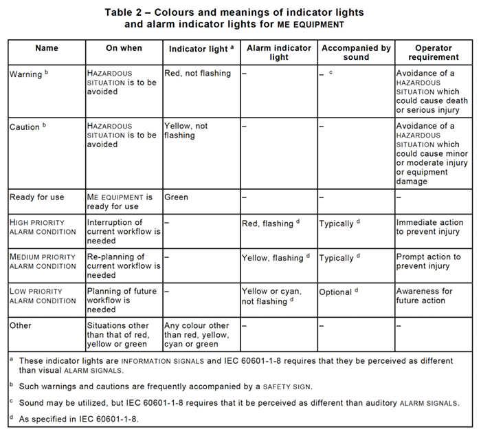 The revised Table 2 of the standard represents a significant improvement over that found in the prior edition of the standard. This updated table was generated by the Joint Working Group on Alarms IECSC62A JWG2 (the Committee which also developed the alarm system standard IEC 60601-1-8). The revised table shows much more clearly and precisely what is expected for indicators (warnings & cautions) and alarms. The most significant change is the addition of more detailed specifications regarding alarms. This is especially important since it may encourage the inclusion of alarm systems that conform with the requirements of IEC 60601-1-8 in the design of medical devices (new and existing).