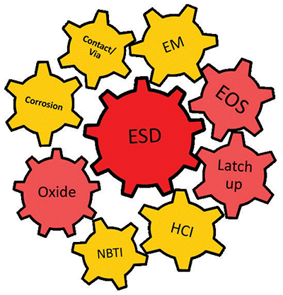 Figure 1 links all of these in a visual manner. ESD reliability is purposely placed at the centre although this is not necessarily true for every IC product development. In fact, often ESD is addressed after a reliable process technology is established. As shown in the figure the reliability issues are all interconnected to both EOS and ESD although not necessarily in the same manner or to the same extent. Each of these reliability aspects have to be first considered separately before the connections to ESD and/or EOS can be understood.