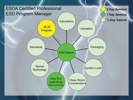 The ESDA Program Manager Certification was developed for individuals that are involved in designing, implementing, managing and auditing ESD control programs in their facility. The program was designed to meet the requirements of the ANSI/ESD S20.20 standard. The certification for Program Manager is a ten course program that covers a variety of topics as shown in Figure 1.