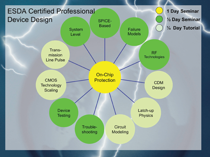 The ESDA Device Design Certification is a twelve-course program that provides the attendee with the information required to successfully participate in any ESD device protection design program. Topics are shown if Figure 2.