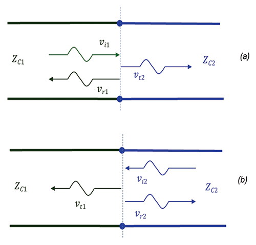 Let’s consider a voltage wave, vi1, traveling on transmission line 1 incident onto the junction, as shown in Figure 1(a). Upon its arrival at the junction the reflected wave, vr1, and the transmitted wave, vt2, are created.