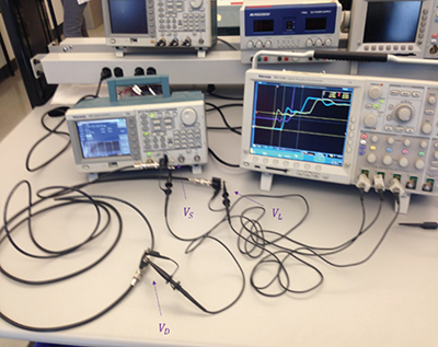 A 10 Vpp (open-circuit voltage) pulse signal was sent from the function generator along the 6 ft-long RG58 coaxial cable (ZC1 = 50 Ω) connected to the 6 ft-long RG59 coaxial cable (ZC2 = 75 Ω) and terminated with an open circuit. The rise time of the waveform is tr = 2.5 ns. The voltages at the source (VS), the discontinuity (VD) and at the load (VL) were measured using the oscilloscope probes.