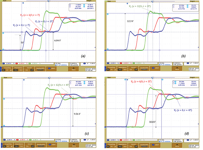 This is shown in Figure 4(d). Finally, the transmitted voltage of 4.8 V arrives at the source at t = 4T, resulting in the source voltage rising to (shown in Figure 4(d)).