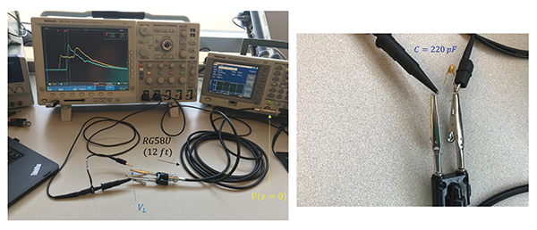Figure 10 shows the experimental setup for laboratory verification using a 12 ft RG58 (ZC = 50 Ω) coaxial cable terminated by a 220 pF capacitor.