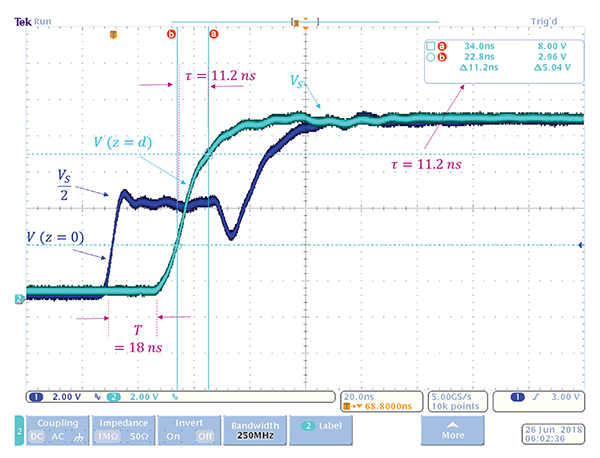 Note that the voltage V at z = 0 location rises to its initial value VS/2 as predicted by Eq. (2a). After the time T =18 ns this voltage wave arrives at the inductor and its voltage jumps to VS, as predicted by Eq. (9). Subsequently, this voltage decays to zero. Also note that the measured time constant of the inductor voltage is 41.2 ns, which closely matches the time constant in Eq. (9), i.e.,