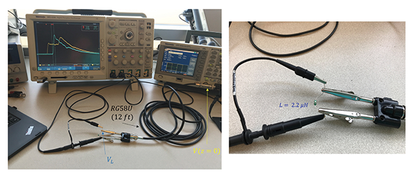 Figure 5 shows the experimental setup for laboratory verification using a 12 ft RG58 (ZC = 50 Ω) coaxial cable terminated by a 2.2 µH inductor.