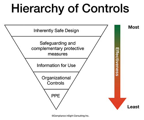 When it comes to the second question, “Apply the hierarchy of controls following the initial risk assessment, then iterate the risk assessment to decide if enough risk reduction has been achieved and if anything more needs to be done. Risks not fully mitigated by inherently safe design measures or engineering controls require the use of hazard warning signs and labels and other information for use (manuals, lights, bells, buzzers, etc.),” Nix says.