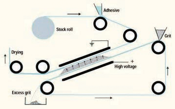 When the grit-covered face leaves the field, a shaker removes loose material and a drier sets the adhesive. The electrostatic deposition of the abrasive provides a more uniform distribution and a more beneficial orientation of the single grains than is possible by a purely mechanical process.