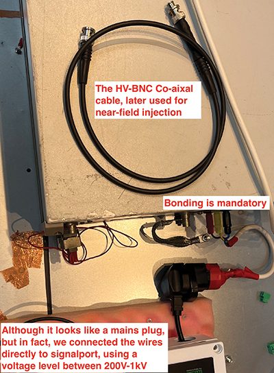 When the failures were reproduced, the next step was to identify the weak point on the PCB. A useful technique involves connecting the HV output of the EFT/Burst generator to a near-field probe. Engineers can then inject noise into suspected weak areas on the PCB while taking HV safety precautions: