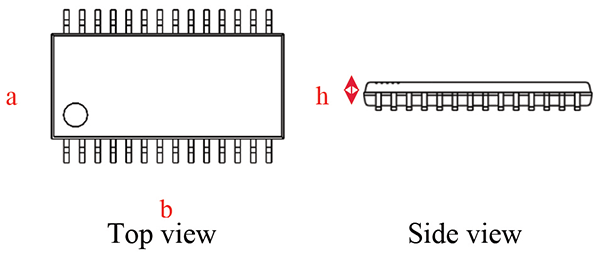 To calculate the CDM discharge current from the volume, the device area is considered as the maximum edge length a x b, including the pins and mold compound (Figure 3). For a bare die product that does not go into a final package, the area is calculated from the edge length of the silicon accordingly.