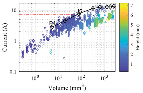 This can be shown using the set of nine cylindrical solid metal coins P1 to P8 with different diameters and volumes (see Table 1)[5]. The coin reference for the peak current still gives a reasonable orientation for the maximum peak current. Figure 4 shows the dependency of the effective capacitance Ceff on the volume. For very flat packages, the limit of the coins is exceeded but still gives a meaningful value. The coin with the smallest volume and, therefore, lowest Ceff reaches the lowest peak current and vice versa. For devices, this means that their Ceff with the according current can be related to the current of the coins. As shown, the device height is becoming relevant for the estimation of the stress current level, therefore, the volume is introduced as the preferred parameter. Thus, the volume value can be used to estimate the expectable peak current with respect to the coin values as shown in Figure 5.