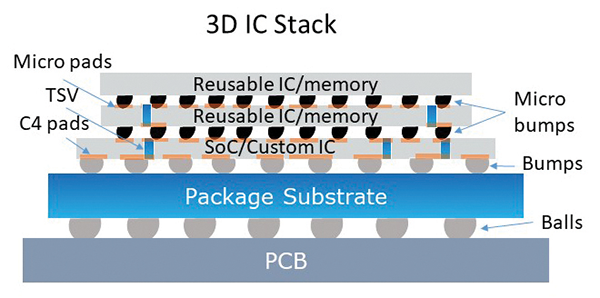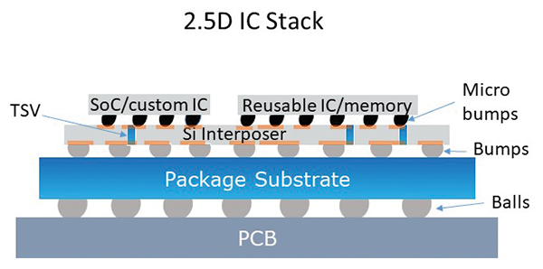 A valid question to ask is what is 3D or even 2.5D packaging about? 3D packaging means to stack dies of silicon on top of each other and contact them in large numbers by die-to-die connections (see Figure 1). Today thousands of interconnects are running between a bottom die and a top die. This is predicted to grow into the tens of thousands to millions of interconnects per square millimeter of die area. One essential step in the process is to use so-called through silicon vias (TSVs) to route power and signals from the bottom side to the top side of a die. 2.5D packaging in contrast describes the assembly of silicon dies side-by-side atop an interposer substrate, which serves as a carrier on which the routing lines/connectivity between the dies are implemented (Figure 2).