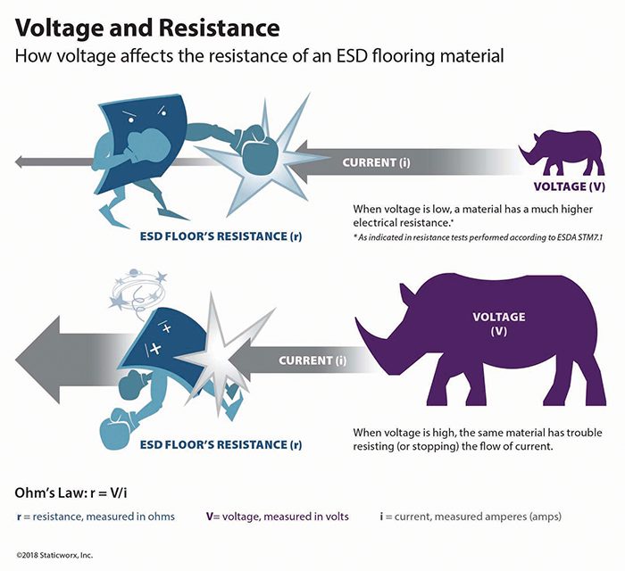 For example, per DOD 4145-26-M, DOD explosives-handling applications require conductive floors as defined by resistance testing at 500 volts. Per ANSI/ESD STM 7.1, the same floor tested at 10 volts might actually measure in the very low part of the static-dissipative range. As previously noted, resistance is predicated by the applied voltage.