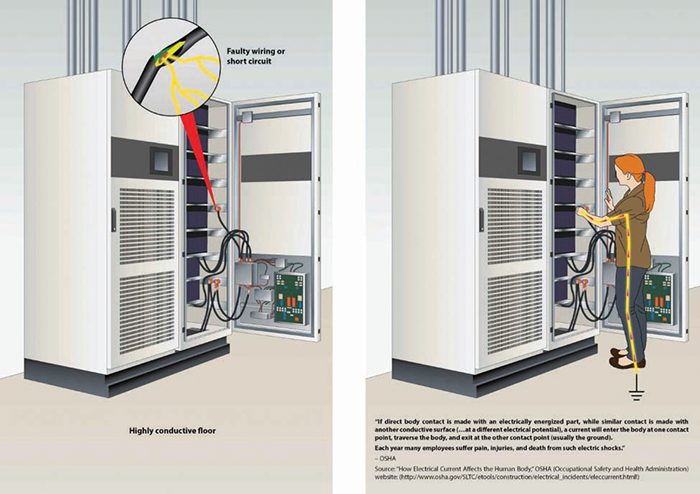 What if this floor system were installed in a space where energized systems were resting on the floor while operating at 480 volts, three-phase. Obviously, any electro-mechanical system resting on the floor would become the groundable contact point and bypass the series resistor (dissipative adhesive) below the bronze tiles.